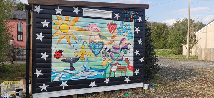 Your Promises to the Planet In 2022, Tanio created a mural on our log cabin, ‘The Base,’ to capture Promises to the Planet from the community. School children, their families, and local residents took part in workshops to imagine what they could do to take care of the planet. Their ideas were added to the mural, and we continue to collect people’s Promises to the Planet now!